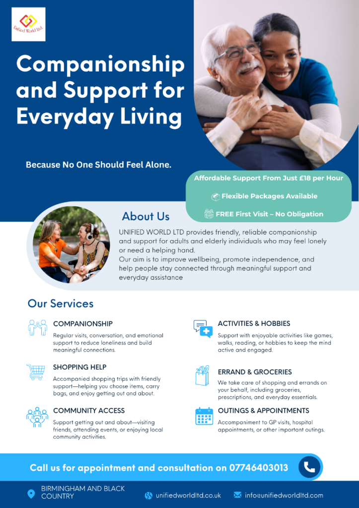 Companionship and Support For Adults and Elderly Living AloneOperates in BirminghamOther Business & Office ServicesBusiness ConsultingBusiness & Career CoachingRequest a quote