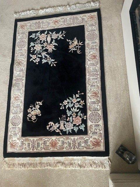 A Quality Authentic Rectangular Chinese Rug. It has a stunning design and measures:- Length: 5ft 1inches - 154.94cm (carpet itself) 7ft 1 inches 215.9cm including the fringe edging. Width: 4ft (121.92cm) The carpet has a thick depth you would ex