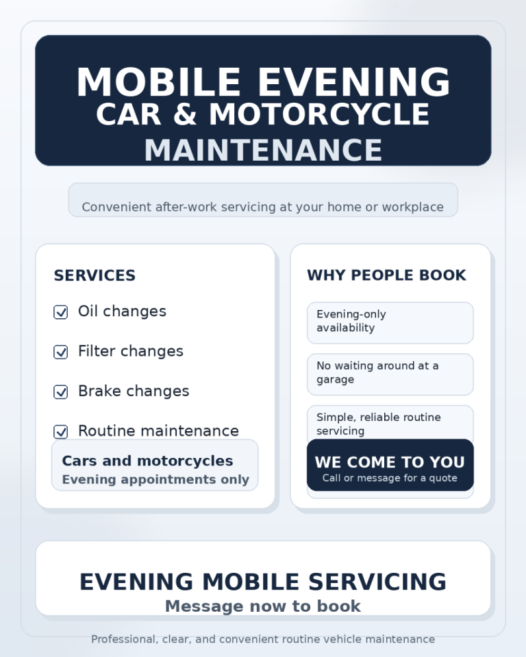 Mobile Evening Car & Motorcycle ServicingOkehampton, DevonGarage & Mechanic ServicesCar & Vehicle MechanicsCar & Vehicle BodyshopsRequest a quote