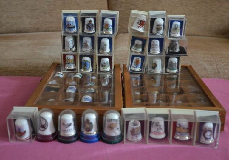 76 THIMBLES 1 MINI TANKARD AND 2 DISPLAY CASES,THIMBLES ARE FROM BLACKPOOL, LOOE, BOURNEMOUTH, JERSEY,KENT, NORFOLK,THE LAKES,CLACTON ON SEA, KENT AND EAST SUSSEX, CORNWALL, ISLE OF WIGHT,LANDSEND,WESSEX,CANVEYISLAND,WROXHAM, POLPERRO,KENT,COLNE VALL