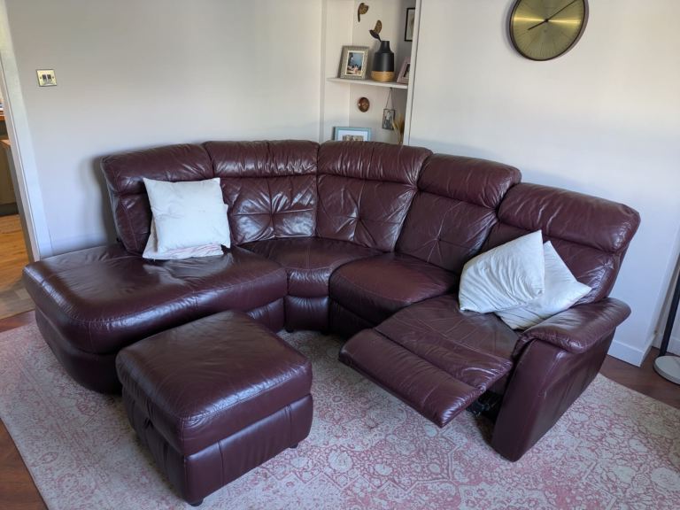 Leather DFS corner sofa. Recliner chair at one end. Burgundy but some discolouration marks where protective coating has come off. Used but will do someone a turn. Foot stool/pouffe has storage. Dismantles into three parts for removal. Collection only