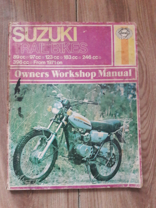 Suzuki trail bikes Haynes manual from 1971 onwards. This manual covers 89cc,97cc, 123cc, 183cc, 246cc 396cc from 1971 onwards. Item is used, all pages are intact and readable some pages have oily marks on them from use of manual but everything is r