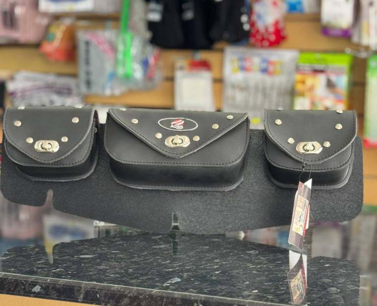 Motorcycle Tool Bag – Black Studded Triple‑Pocket Saddle Bag with Metal Clasps