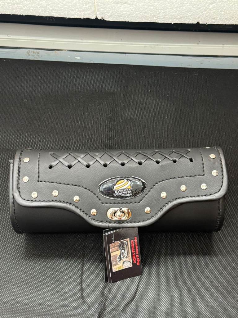 Motorcycle Tool Bag – Black Studded Cylinder Saddle Pouch with Metal Clasp