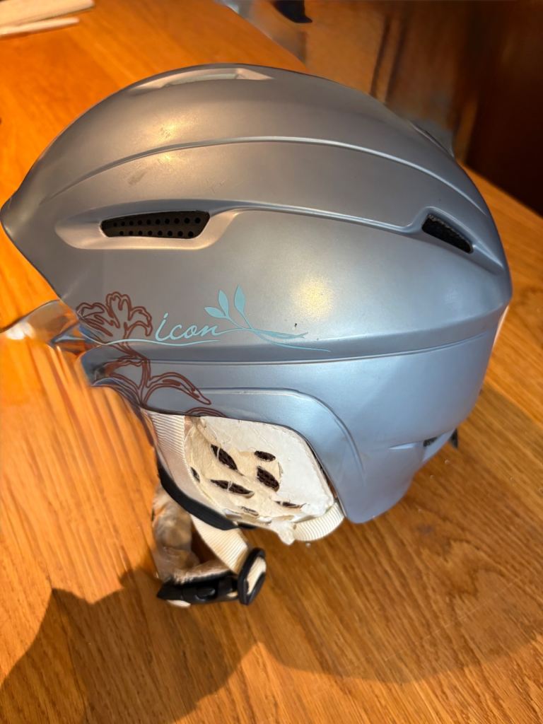 salomim icon ladies ski helmet in beautiful egg shell blue. size medium. very comfortable and very warm. pads over ear slightly worn but still fully functional