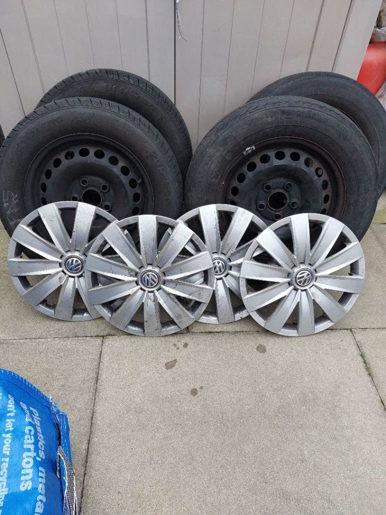 Set of four VW Transporter wheels and tyres, including original Volkswagen wheel trims.