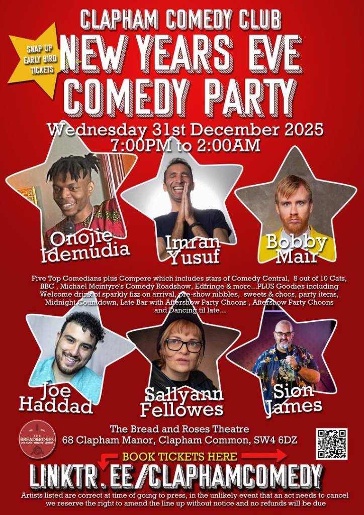 Wednesday 31st December 2025 Clapham Comedy Club New Years Eve Comedy Party : Bobby Mair , Imran Yusuf, Sallyann Fellowes , Onojie Idemudia, Joe Haddad and MC Sion James Five Top Comedians plus Compere which includes stars of Comedy Central