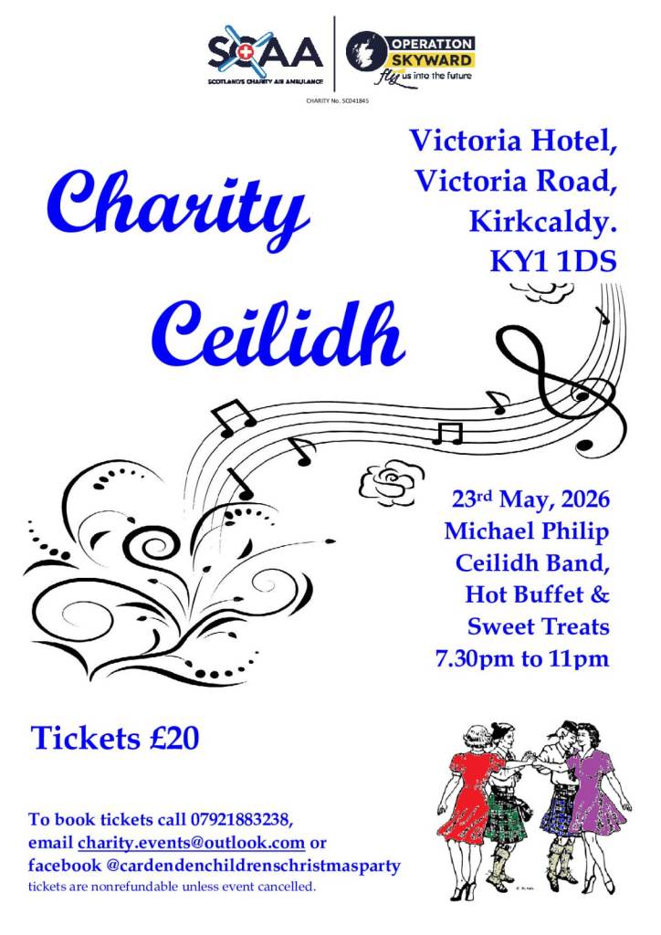 Get your dancing shoes on & your feet tapping. Enjoy a night of music raising funds for Scotland's Charity Air Ambulance at a Charity Ceilidh with the Michael Philip Ceilidh Band, a demonstration from a local dance school, a hot buffet of stovies or