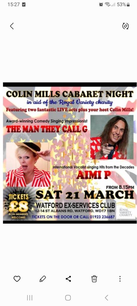 Watford Ex-Services Club Colin Mills Cabaret Night Compere Colin Mills IN AID OF THE ROYAL VARIETY CHARITY 2 superb acts The Man They Call G Comedy vocal impressionist As seen on Britain's Got Talent Aimi P International Vo