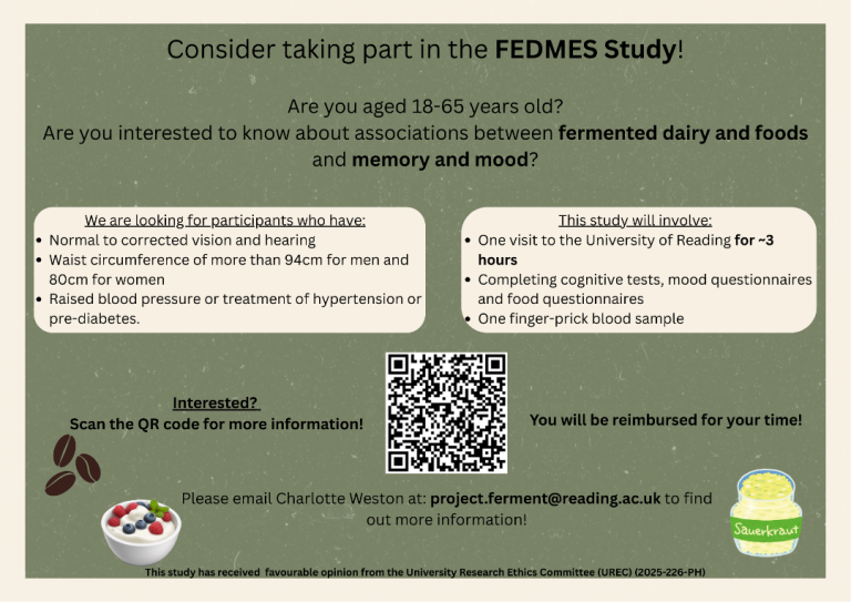 Hi people of the local area 🙂 I am a PhD student at Reading University, currently recruiting for a cross-sectional study looking at the associations between fermented dairy consumption and cognition, mood and blood markers. We are looking for adults