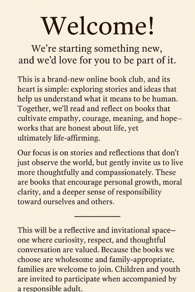 This is a new group. So we need you to join us. Our book club explores stories and ideas that help us understand what it means to be human—through empathy, courage, meaning, and hope. We read books that invite reflection and encourage us to live mo