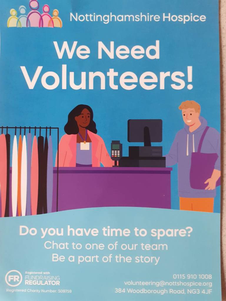 Nottinghamshire Hospice needs volunteers at its new shop in Beeston ng9! If you have time to spare, join the team and be part of the story! Interested then pop into the shop (opposite sainsburys) for a chat or search volunteering at nottshospice,org