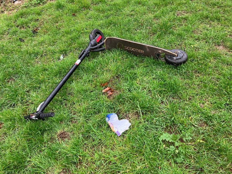 1E ScooterAbandoned slight damaged possibly been stolen. lying on grass near play area Millers Meadow St Andrew’s Road Northampton Northamptonshire England Northampton, Northamptonshire