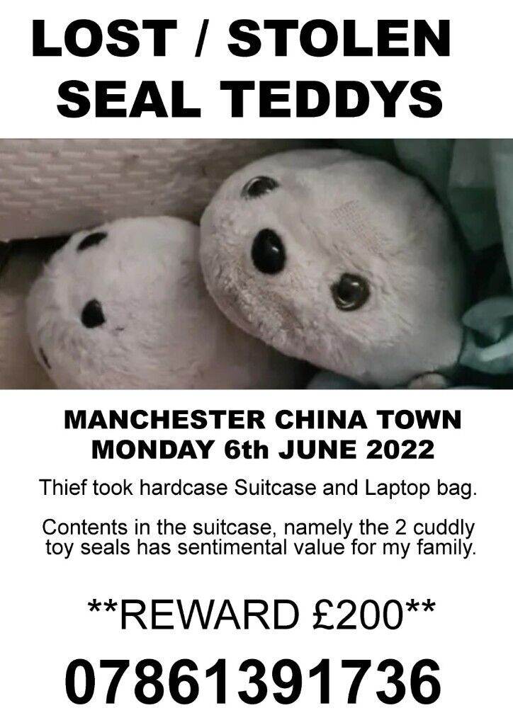 Car got broken into in Manchester China Town in June 2022. Thief took small black suitcase (hand carry size) and laptop bag. Not fussed about them but more bothered about the 2 seal teddy bears that belong to my daughter. Get in contact if you've see