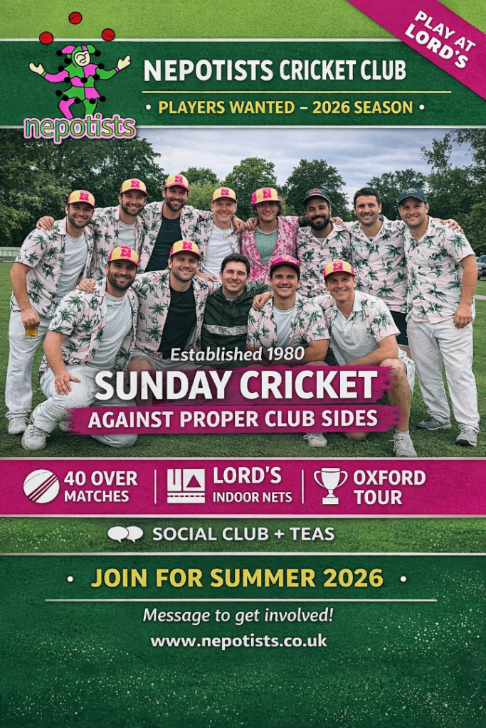 Looking to play proper weekend cricket in London this summer? The Nepotists Cricket Club are recruiting players for the 2026 season. We are a London-based wandering side playing mainly Sunday friendlies against established club teams across London.