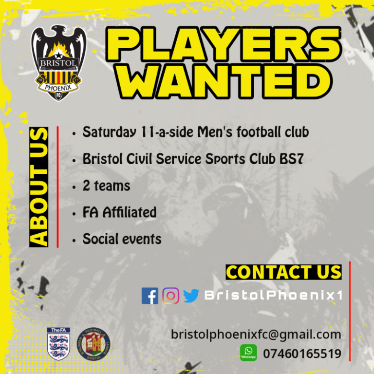 Bristol Phoenix are recruiting players for the 2024/25 Season. • Saturday men's football club • FA Affiliated • 2 Teams • Wednesday Training • North Bristol (Horfield/Filton) • Social Events We welcome players to join our multi-national an