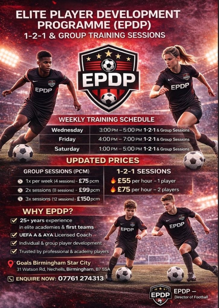 ⚽ ELITE PLAYER DEVELOPMENT PROGRAMME (EPDP) ⚽ 1-2-1 & Group Training Sessions 🚀 Develop-Perform-Compete 🗓 WEEKLY TRAINING SCHEDULE Tuesday 🕒 6pm-8pm PM Group Session Thursday 🕓 6pm-8pm Group Sessions Friday 🕓 6:30pm-8:45pm Gr