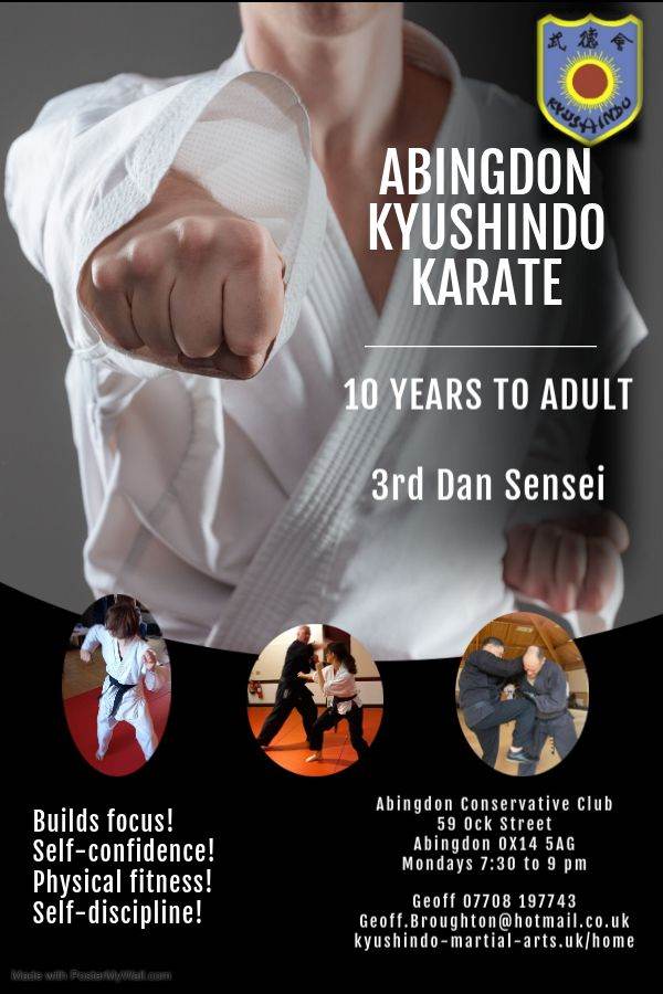 Karate in Abingdon is LOW COST. Training at the Abingdon Conservative Club, 59 Ock Street OX14 5AG. Ideal for Juniors and Adults. Mondays 7:30 pm and Saturdays noon. There are also clubs in Didcot, Little Milton, Oxford, Reading and Stokenchurch e