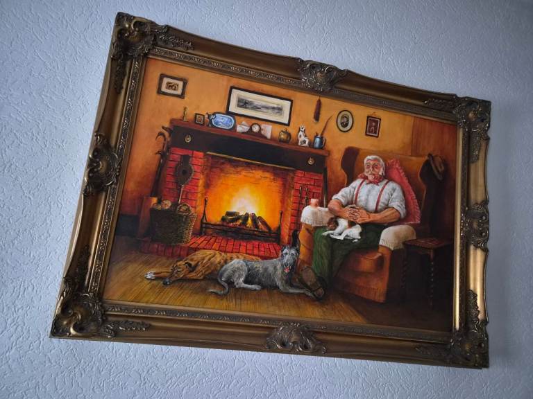 The "Oill painting game Keeper one of kind" by artist Graham Blowham is a large, framed acrylic painting depicting a gaming theme. This unique piece was produced in 2006 using oil painting techniques, making it an original and one of a kind (OOAK) cr
