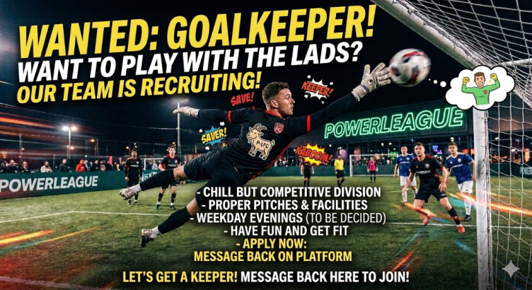 We are a competitive but friendly side looking for a permanent shot-stopper to join our Powerleague squad. What we’re looking for: Quick Reflexes: Ability to handle low, hard shots on the 4G surface. Distribution: Someone who can distribute qui