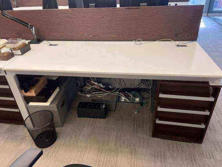 Walnut/White Executive Duty Office Table/Desk with supporting pedestal leg 180cm x 80cm £250 3 available Dismantled for ease of movement and collection, set-up will incur an assembly fee. In general used condition; sold as seen. We do not offer re