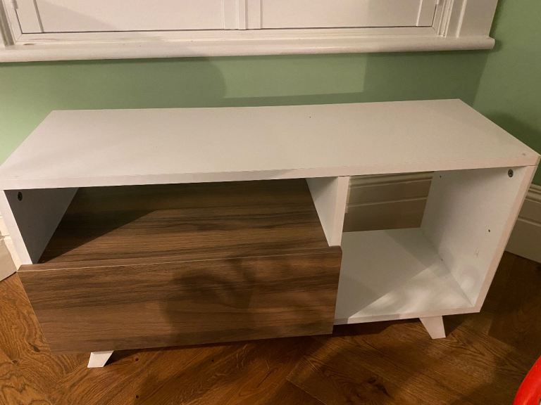 MDF unit - white and dark wood look. Built in cabinet with shelf and open back to allow wires to enter