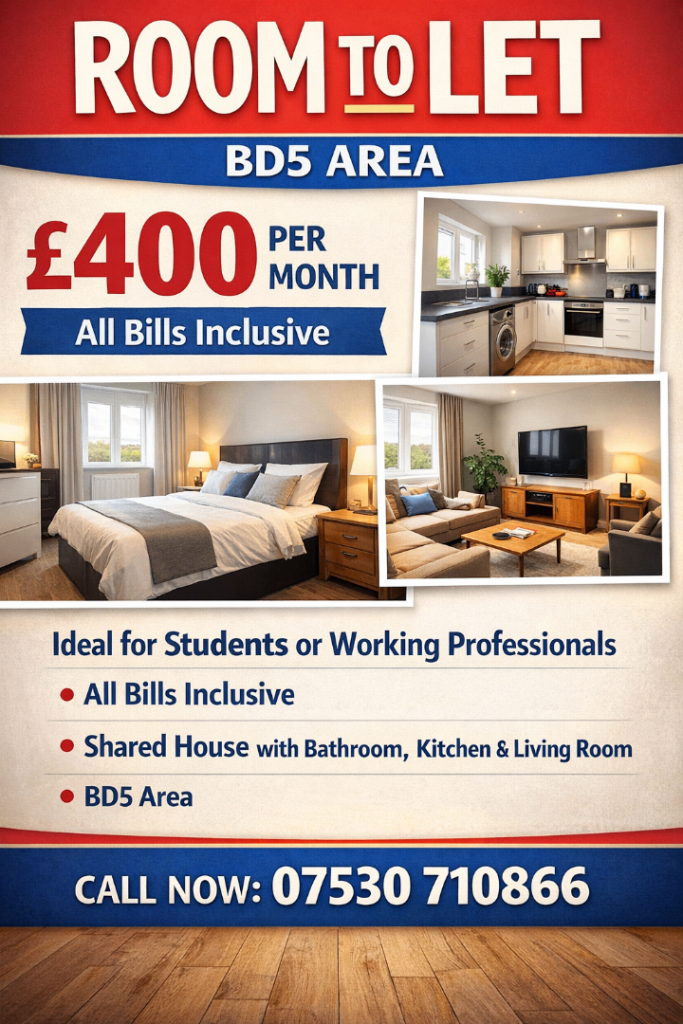 5ROOMS TO RENT IN SHARED ACCOMMODATION - £200 DEPOSIT - CALL NOW TO BOOKAgencyDate available: 19 Jan 2026OtherBradford, West Yorkshire£450pm