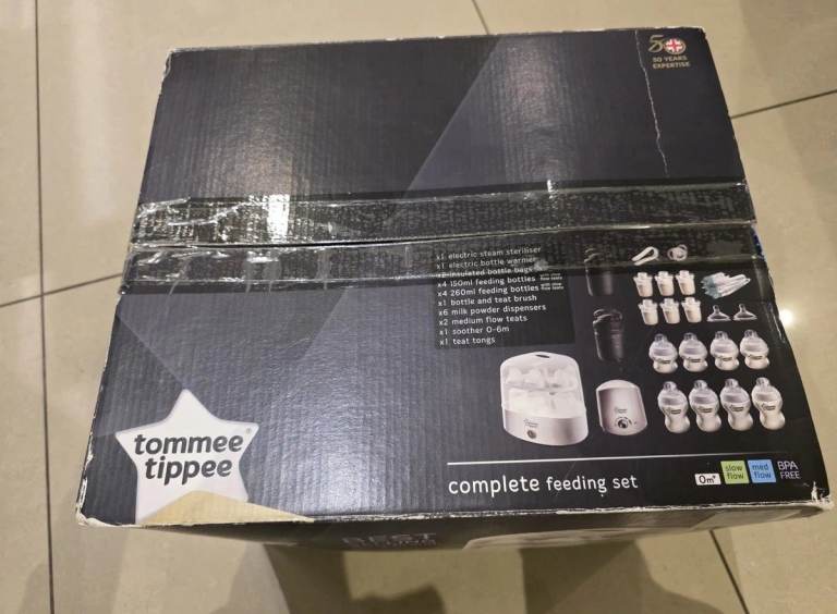 Tommee Tippee baby's complete feeding set in white. Boxed, unopened and brand new. Contents of box listed in photos. £100 in shops. Selling for only £40. Item is still available for collection from E12.