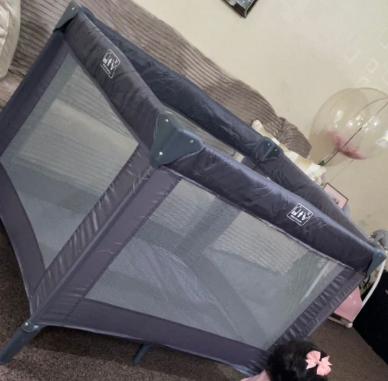 cot mobile kidsline with music. knitted vehicles with shade and wind up rotary function. like new partially assembled never used