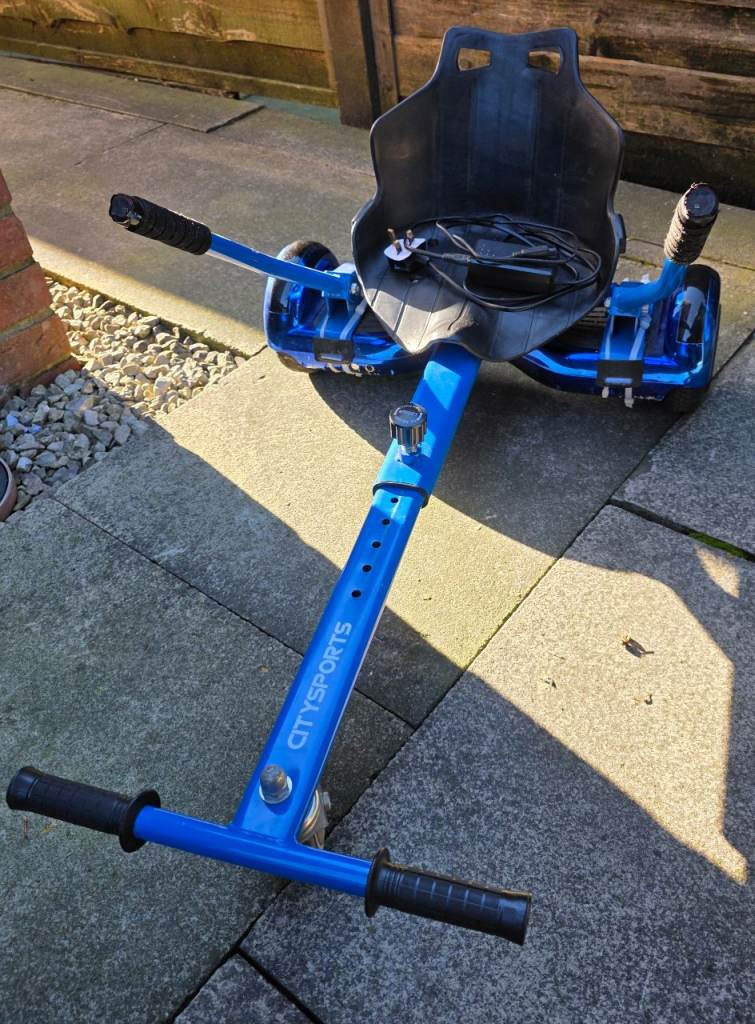 Hoverboard with attachable kart. My son has now outgrown this unfortunately. Kart is currently attachable by large cable ties, as these were better than the original straps. Board can be Bluetooth connected and led lights. Comes with charger. C