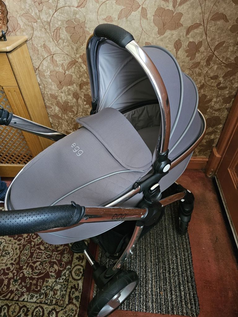 Egg pushchair with 2 separate attachments- the bassinet and the stroller. A slight mark on the hood shown in photos- cant notice when in use. A good sturdy frame. Comes with egg raincover. Open to offers- just want it to be well loved.