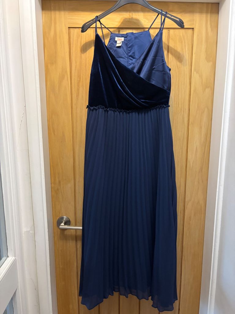 Worn once for a wedding. Lovely detail to neck. Pleated throughout. Hand washable. Minor fray to the ribbon belt (see photograph) - this could be replaced but not noticeable and just noted a small snag to the bottom - see photo - again not noticeable