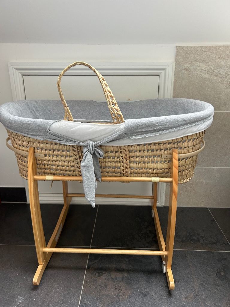 Lovely Moses basket with stand, 3 set of sheets and cover to make it extra cosy. In great condition except for the left side handle as seen on picture. Collection only