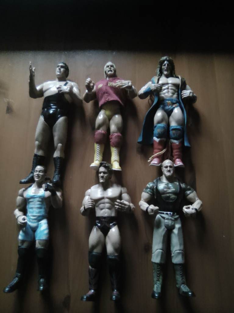 Six wrestling figures,Andre the giant,Hulk Hogan,Ultimate Warrior,Rob Van Dam, Slaughter and Jericho, perfect condition