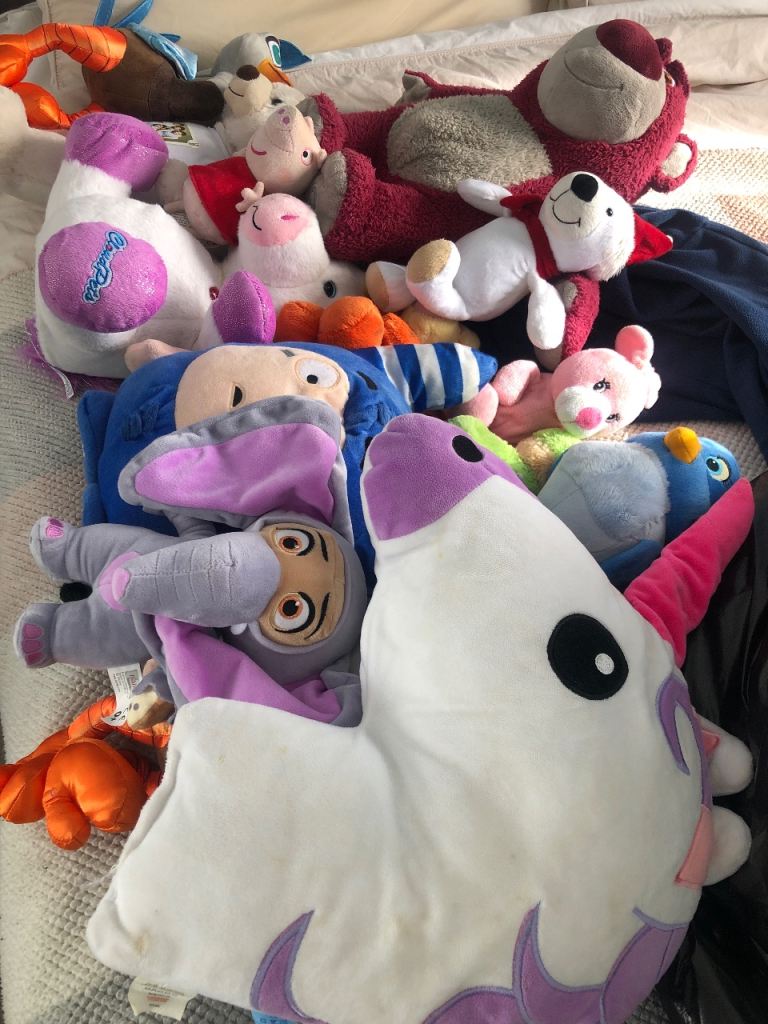 About 15 soft toys missed sizes suit different ages all used but in very good condition free to first person who collects