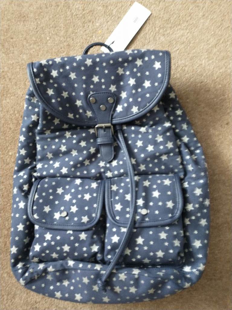 GIRLS BACKPACK. NAVY, SMALL SILVER STARS. FAUX-LEATHER STRAPS ON BACK. MAIN - STUD FASTENING WITH INNER TIES TO CLOSE. SMALL INNER ZIPPED COMPARTMENT FOR PURSE. TWO FRONT POUCH POCKETS WITH STUDS TO CLOSE. BOUGHT IN SALE FOR £10, SELL FOR £8. NEW, ST