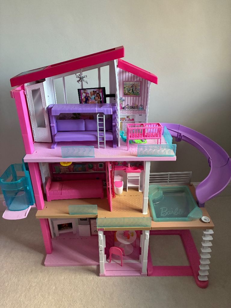 Barbie dream house player with slide and pool. Has 3 floors and working lift. Comes with bed, sofa bed, toilet (with flush sound), dining table and chairs. Note some discolouring on top floor as shown in pictures. Slide can be removed to make it smal