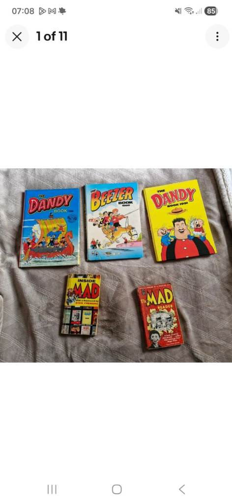Bundle Of 5 Vintage Comic Annuals Dandy Beano 1988 Beezer 1988 Dandy 1991 Inside Mad Mad Reader comic book annuals in very good condition mad books in fair/ good condition some damage to spine (see photos) any questions please message sent i