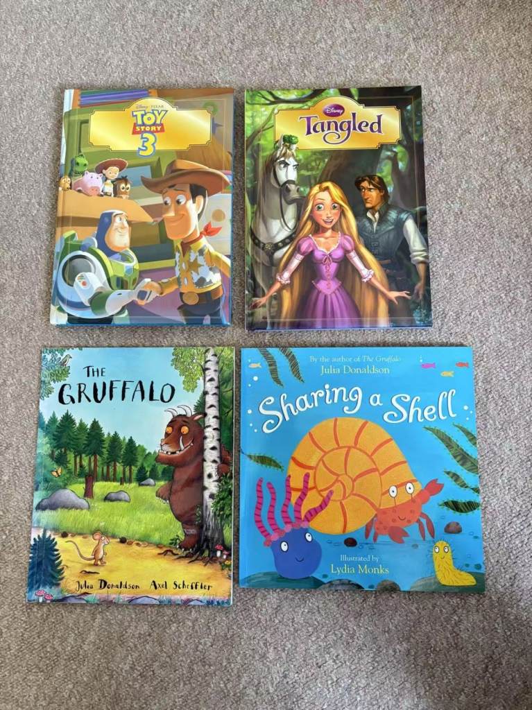 4x children books: Toy Story 3, Tangled, The Gruffalo, Sharing a Shell All in very good conditions. Sell for £10
