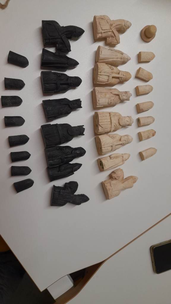 Here is a partially full set, the only piece missing is one white pawn. I used a wooden bottle stop which I planned to carve into shape. One queen has a crack but this could have been from the original resin.