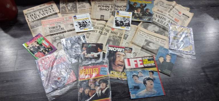 Beatles collectibles including John lennon newspaper report on the day he died. Magazines from their era from Life and Now magazines. American newspapers included a single vinyl. For Beatles fan or collector of memorabilia. Offers please. No time wa