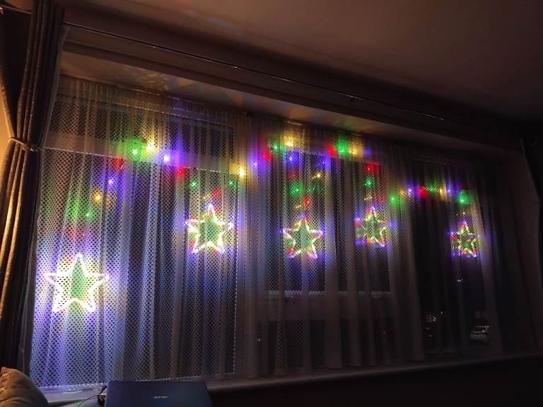 A really nice set of 5 star led decorations, bought from habitat, cost £25 new. Power rated 3.6w, 5 colour changing stars with different effects, fade, flash all on etc. star size 28cm (quite big) distance between stars 100cm, but depends how you ha