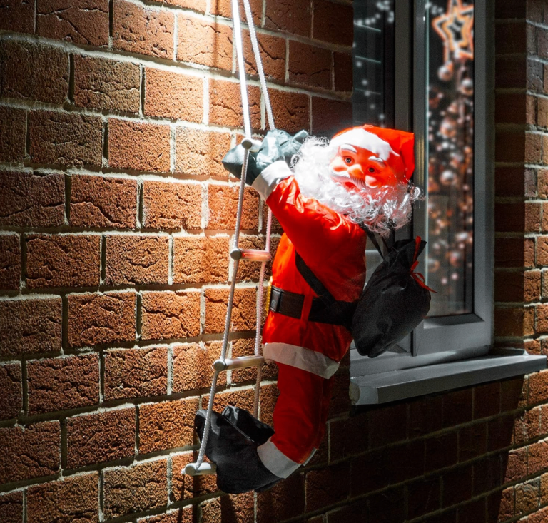 MAGICAL CLIMBING SANTA: Add festive charm with this vibrant Santa as he climbs your chimney or decorates your yard, spreading outdoor Christmas decorations joy. REALISTIC CHARM: Designed with fine craftsmanship, Santa's cheerful expression and lifel