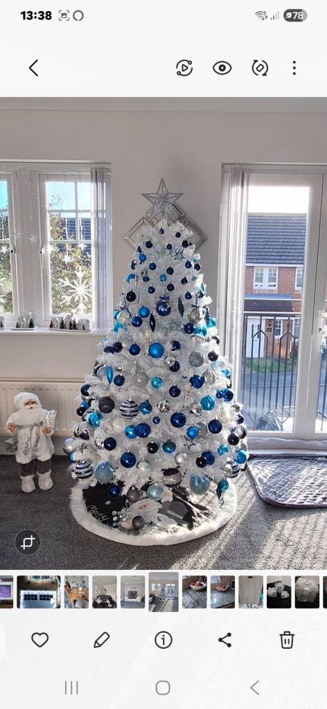 6ft bianca pine christmas tree, in brand new condition, This tree has no gaps and really bushy and wider at the bottom, It comes with over 350 baubles most bought from next, Light up tree topper, 360 white multifunction lights, And tree skirt, Sell