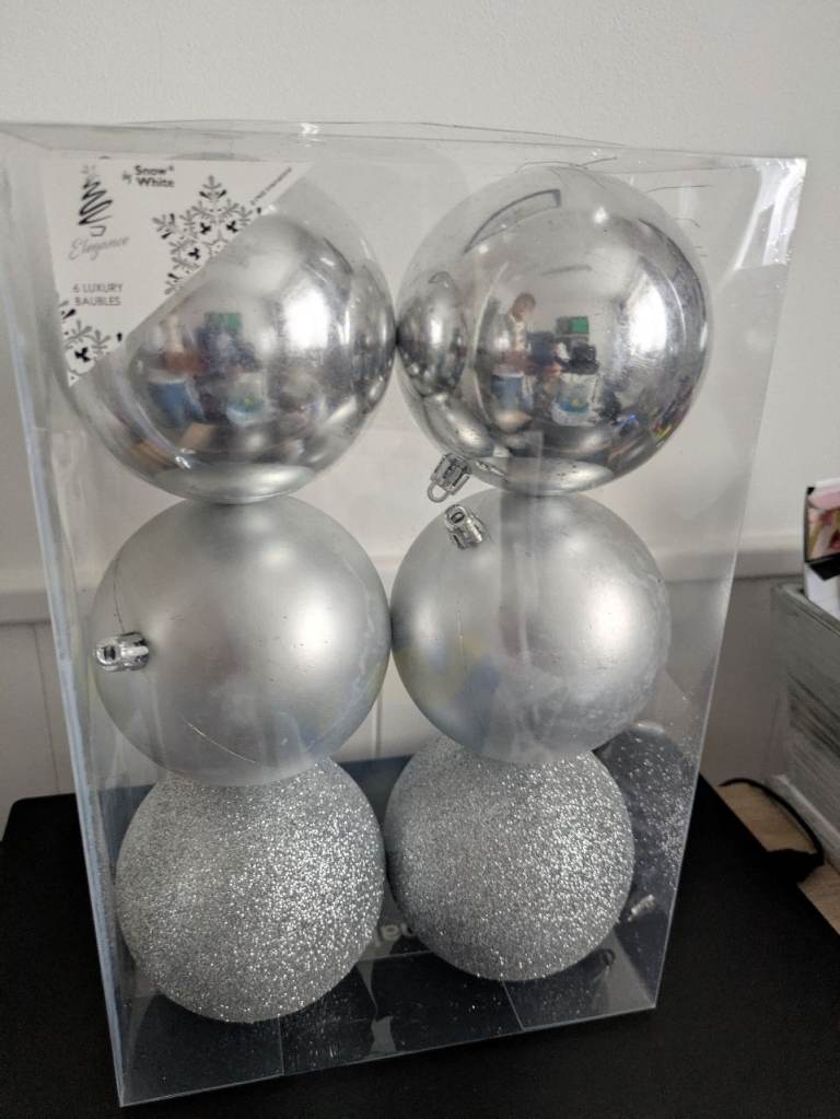 Brand new pack of large Christmas baubles. Silver. Approximately 3". Collection only from Offerton, Stockport.