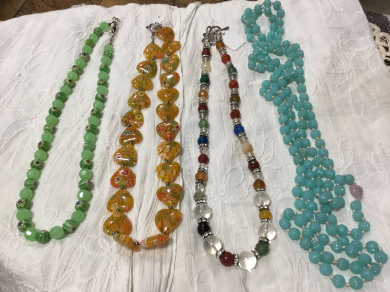 4 ATTRACTIVE GLASS. NECKLACES, SELLING SEPARATELY, 3 @ £15. 1 @ £20 GREEN,APPROXIMATELY 20” length PLAIN & FLORAL BEADS. £20 ORANGE, HEART SHAPED FLORAL BEADS, APPROX. 20” long. £15 MIXED COLOURED GLASS, APPROX. 20” long £15 TURQUOISE, WITH 1