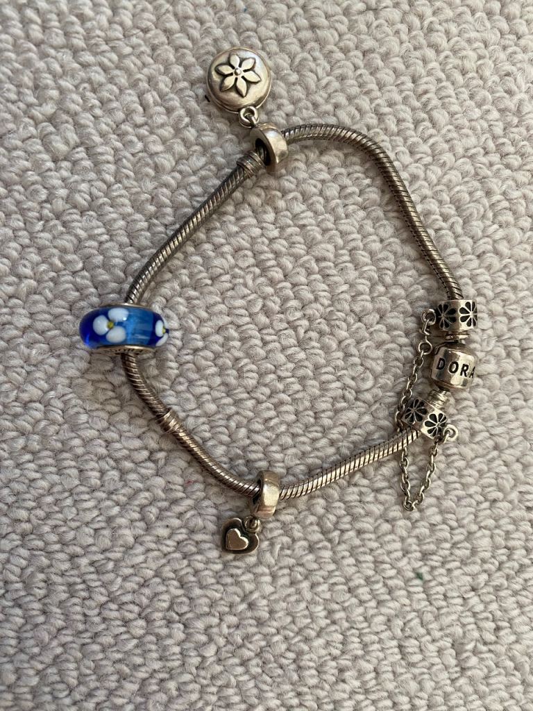 Sterling silver Pandora bracelet with 4 charms. Only worn a few times but I’ve had it a long time and it could do with a quick clean with silver cut. Worth around £180 new. 20cm long.