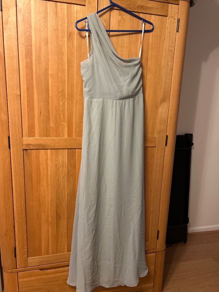 Dress no longer needed after a bridesmaid pulled out of impending wedding. Never worn and never been altered. One side of dress off shoulder, floor length and side split.