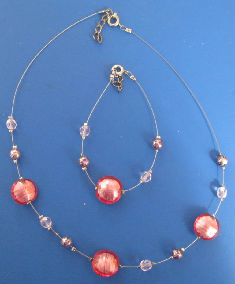 Necklace and bracelet sets - Silver chained necklace with purpley dangling beads and matching bracelet Necklace and Earring sets - Delicate necklace and bracelet with pink and lilac stones. Gold coloured necklace with small 3 stoned pendant and