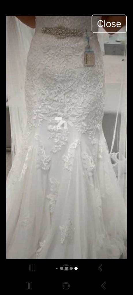 Beautiful Ivory Size 10 wedding dress , immaculate . Separate sash belt that ties to a bow to the back of dress with silver beads on the front of belt . The dress originally cost £950.00 and belt £85.00. All boxed I am 5ft 5in tall and wore 3in h